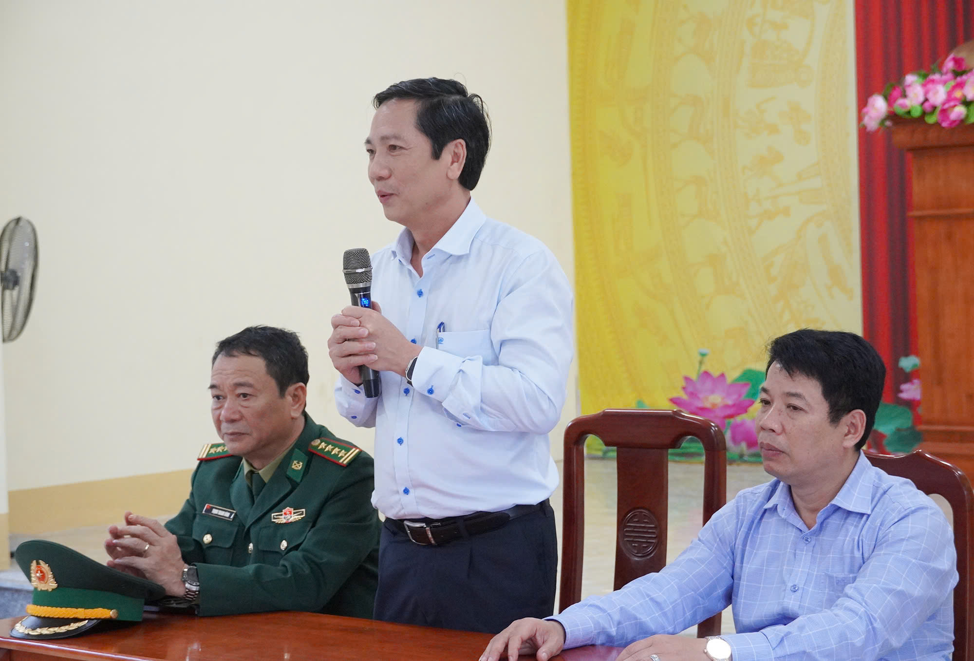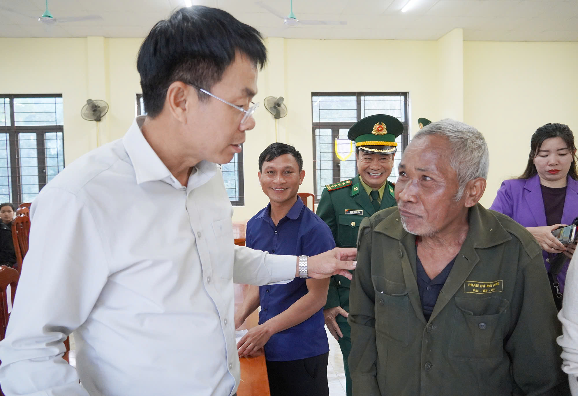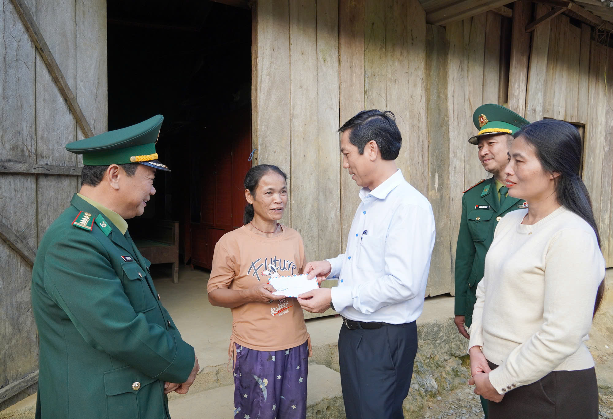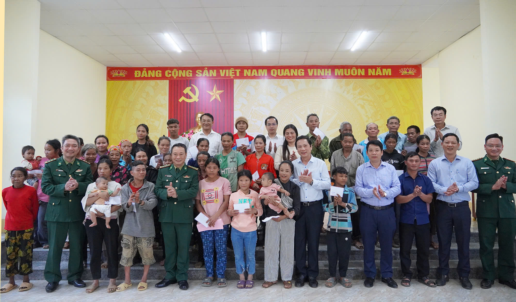Phó Chủ tịch Thường trực UBND tỉnh Hoàng Nam và Phó Chỉ huy trưởng Bộ Chỉ huy Quân sự tỉnh, kiêm chỉ huy trưởng Ban Chỉ huy BĐBP, Đại tá Trịnh Thanh Bình trao quà cho bà con ở bản Mò O Ồ Ồ, xã Kim Phú