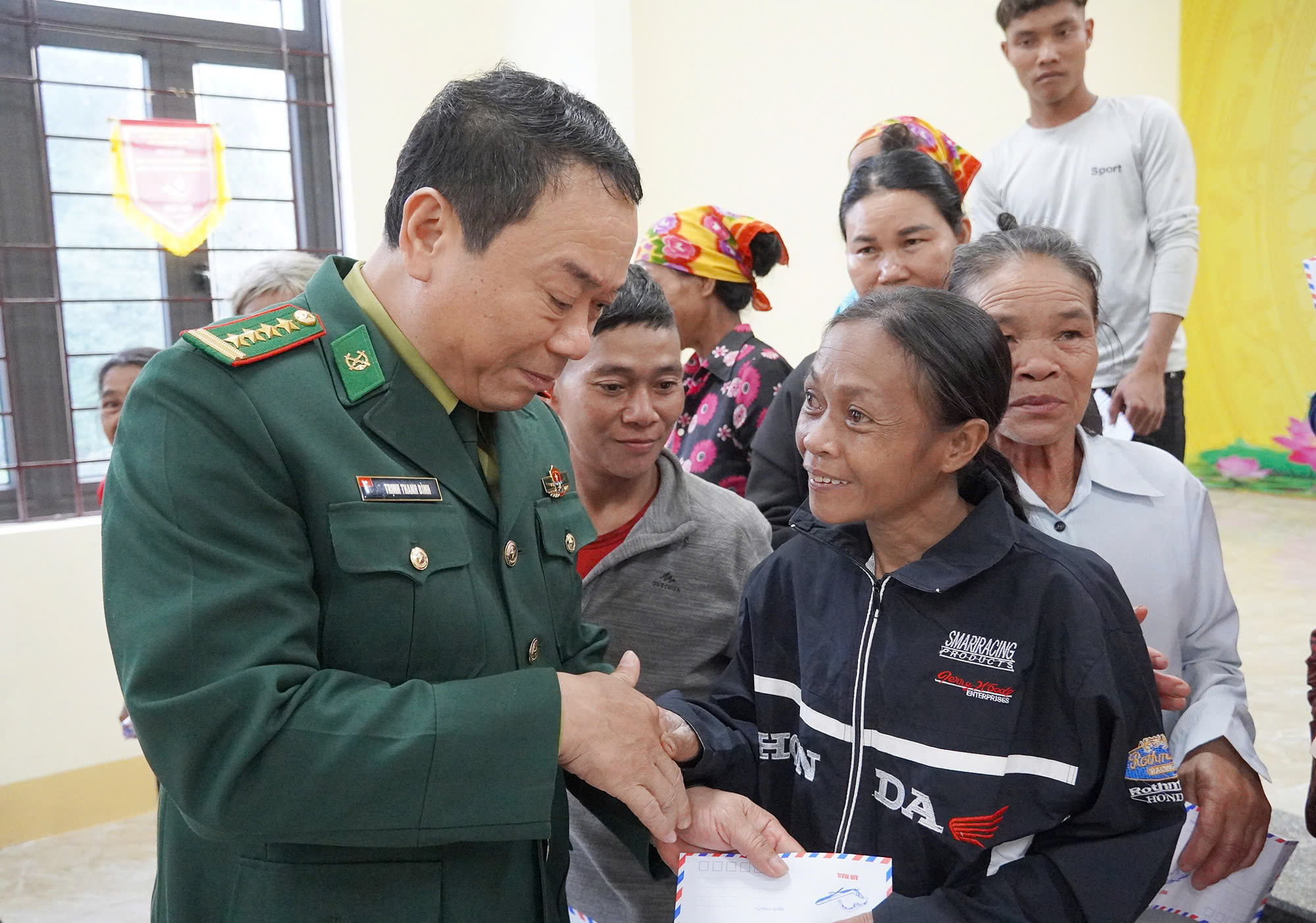 Phó Chỉ huy trưởng Bộ Chỉ huy Quân sự tỉnh, kiêm chỉ huy trưởng Ban Chỉ huy Bộ đội Biên phòng, Đại tá Trịnh Thanh Bình trao quà cho bà con ở bản Mò O Ồ Ồ, xã Kim Phú