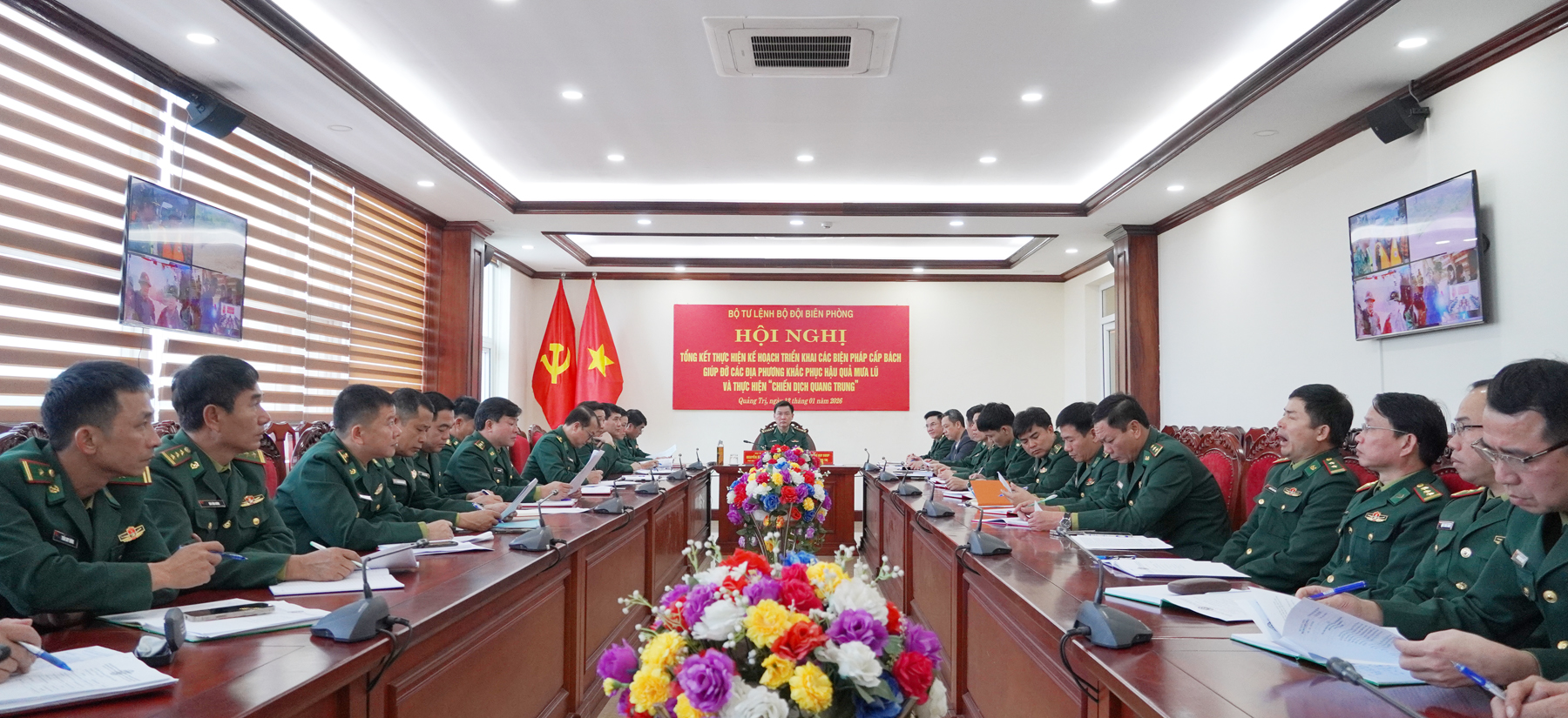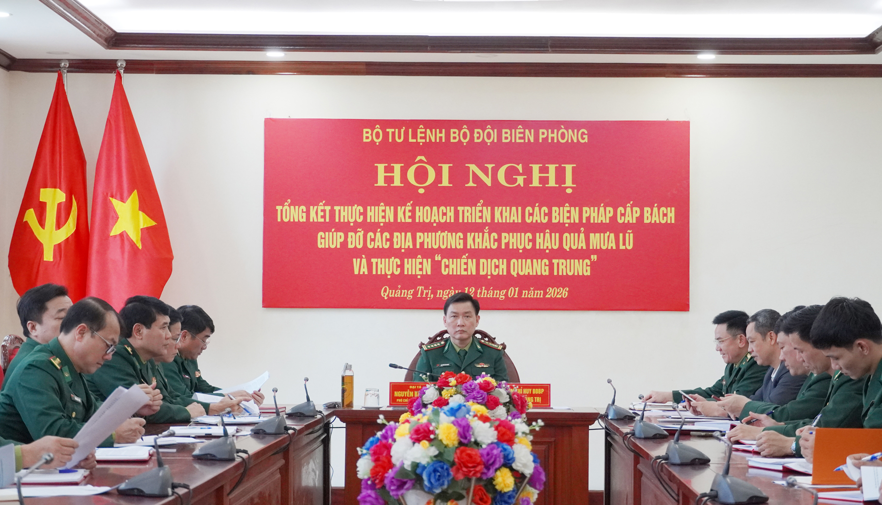 Chiều 12/1/2026, Bộ Tư lệnh Bộ đội biên phòng (BĐBP) tổ chức tổng kết thực hiện Kế hoạch triển khai các biện pháp cấp bách giúp đỡ các địa phương khắc phục hậu quả mưa lũ và thực hiện “Chiến dịch Quang Trung” do Trung tướng Vũ Trung Kiên, Tư lệnh BĐBP chủ trì. Đại tá Nguyễn Bá Duyệt, Phó Chỉ huy trưởng, Tham mưu trưởng Ban Chỉ huy BĐBP tỉnh chủ trì tại điểm cầu Ban Chỉ huy BĐBP tỉnh Quảng Trị.
