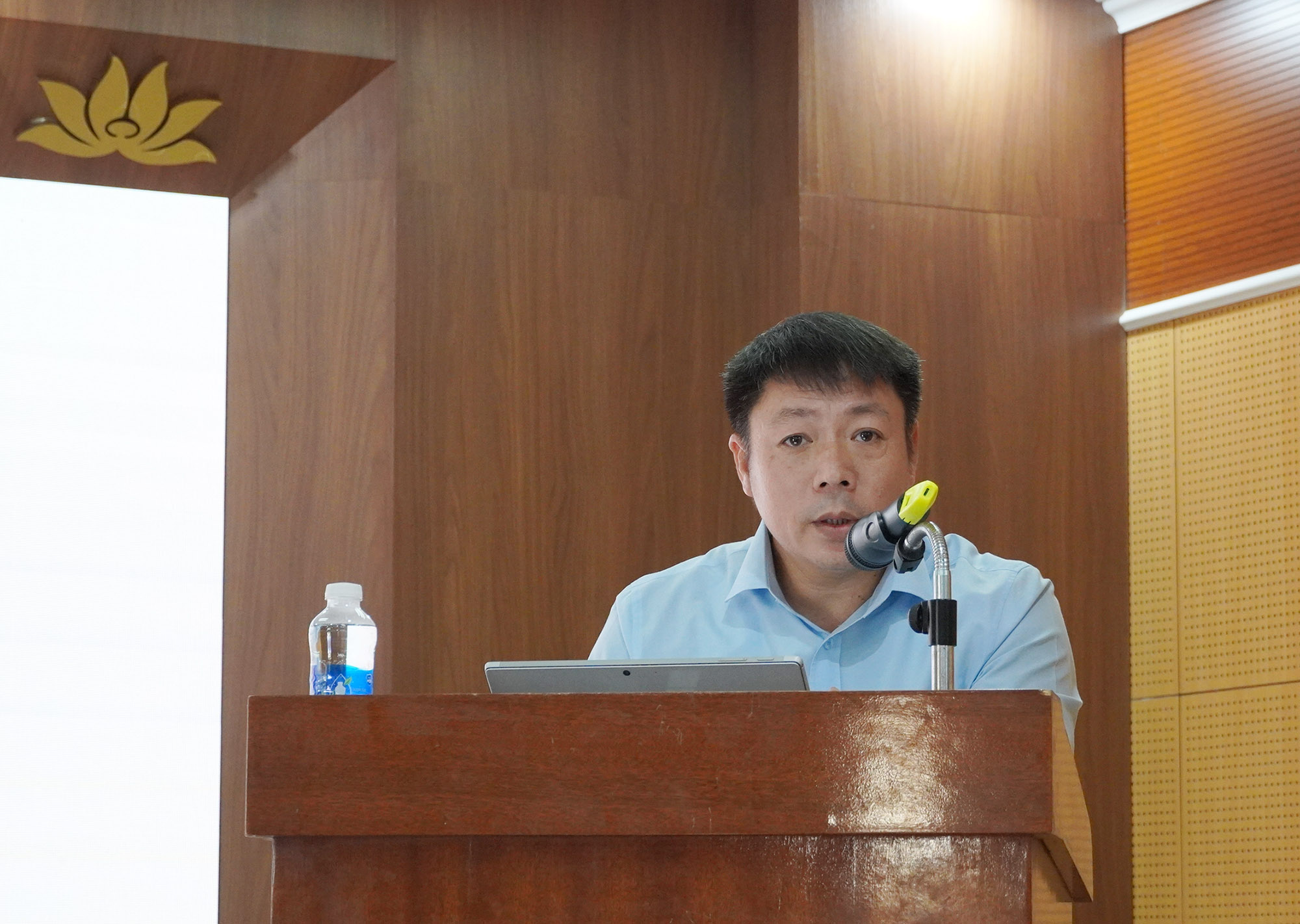 Phó Giám đốc Trung tâm Phục vụ hành chính công tỉnh Hồ Văn Thành trình bày báo cáo tại hội nghị