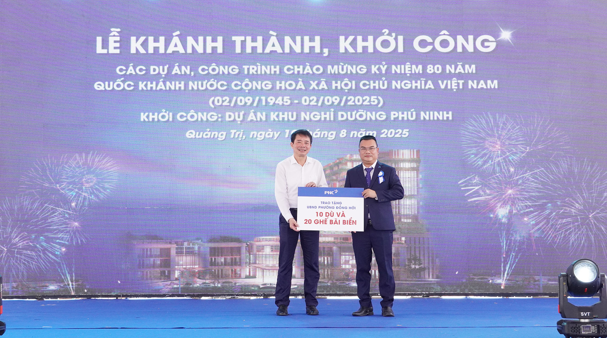 Nhân dịp này, PNC đã trao tặng 1 tỷ đồng để hỗ trợ Chương trình xóa nhà tạm, nhà dột nát trên địa bàn tỉnh Quảng Trị; đồng thời hỗ trợ dù và ghế bãi biển cho UBND phường Đồng Hới, góp phần cải thiện điều kiện phục vụ cộng đồng, phát triển du lịch địa phương.