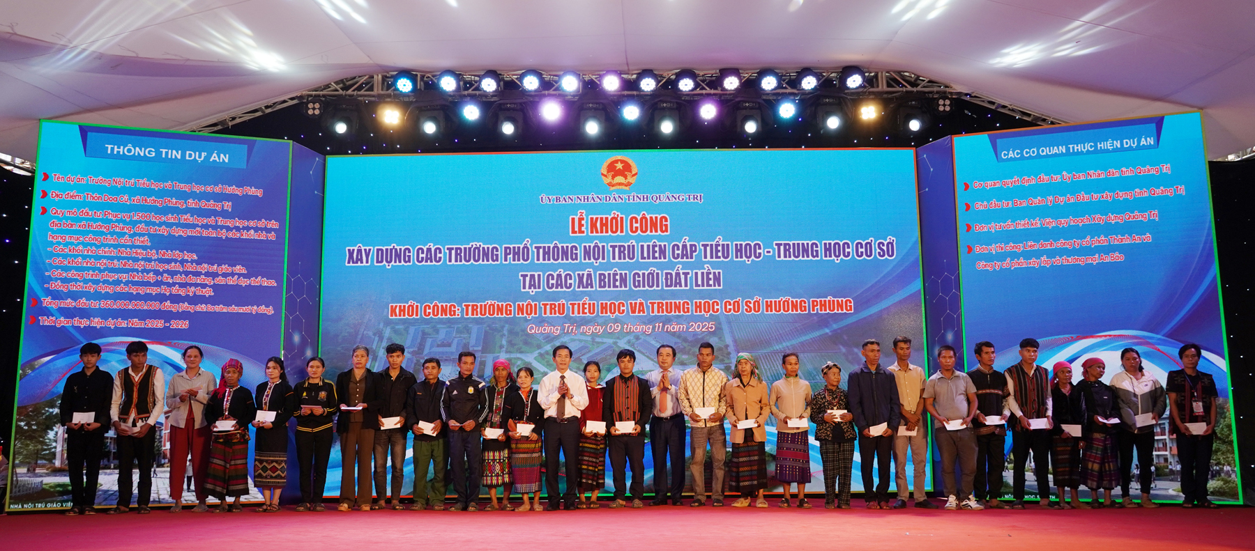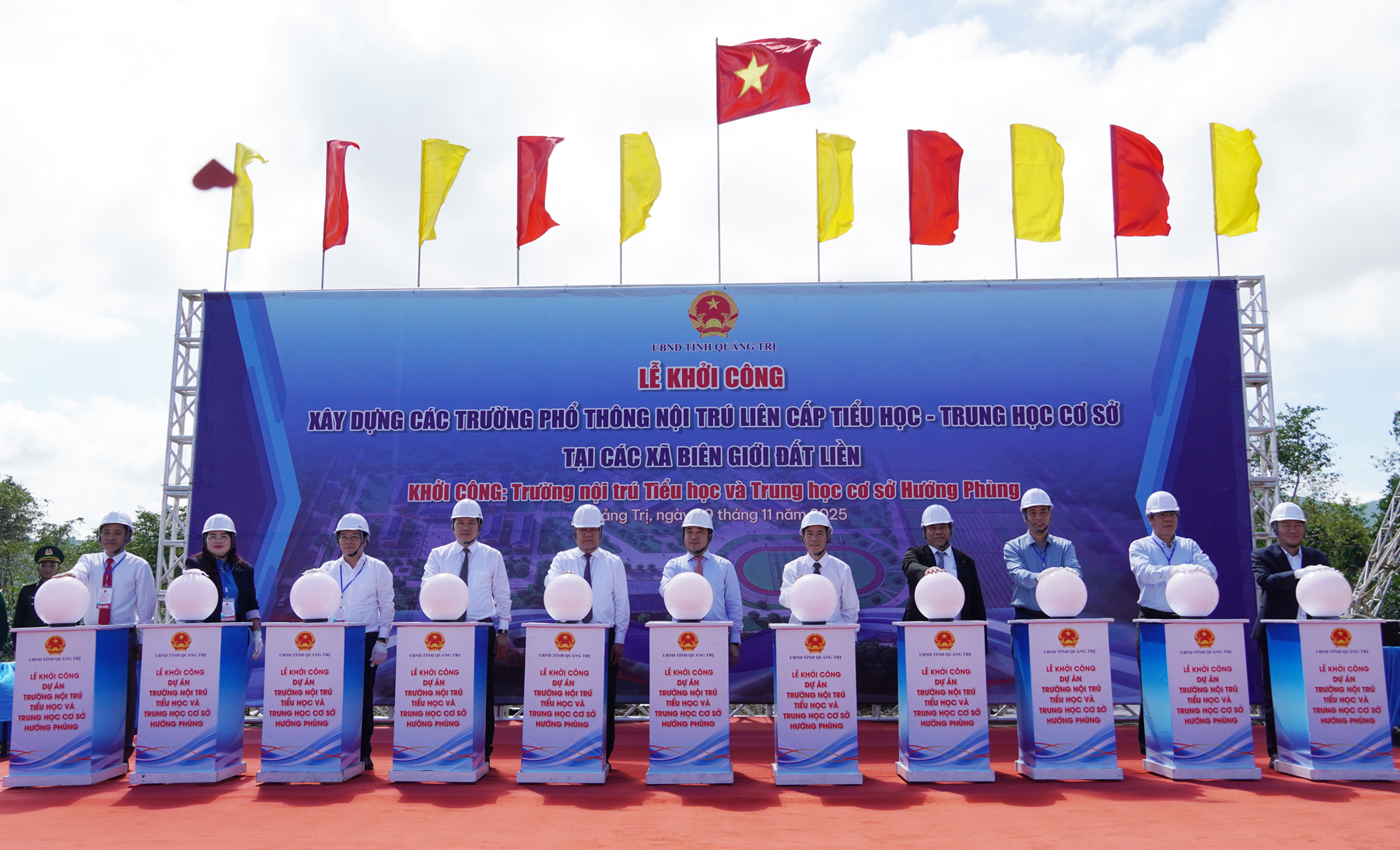 Tiếp đó, Bộ trưởng Bộ Nông Nghiệp và Môi trường Trần Đức Thắng, Bí thư Tỉnh ủy Quảng Trị Nguyễn Văn Phương cùng đại diện lãnh đạo các Bộ, ngành Trung ương và tỉnh Quảng Trị đã thực hiện nghi thức khởi công xây dựng Trường nội trú Tiểu học và THCS Hướng Phùng.